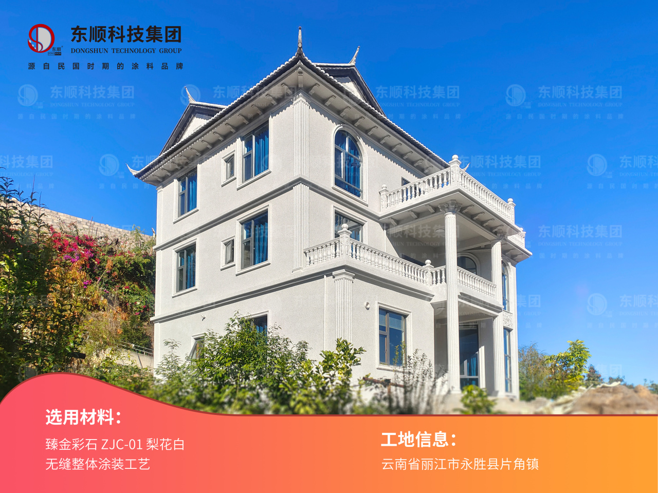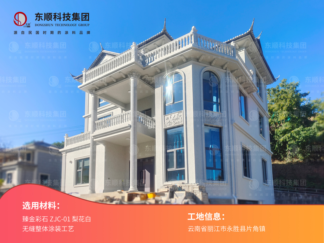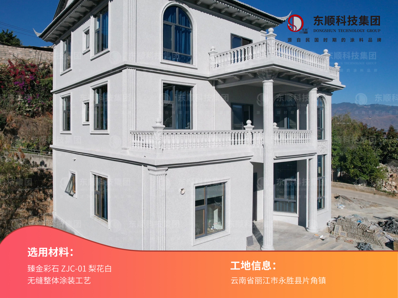 云南省丽江市永胜县片角镇 臻金彩石别墅案例 色号:ZJC-01梨花白 无缝整体涂装工艺