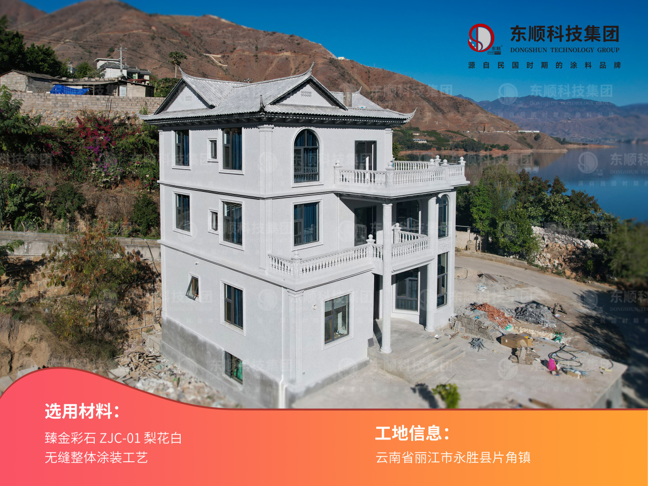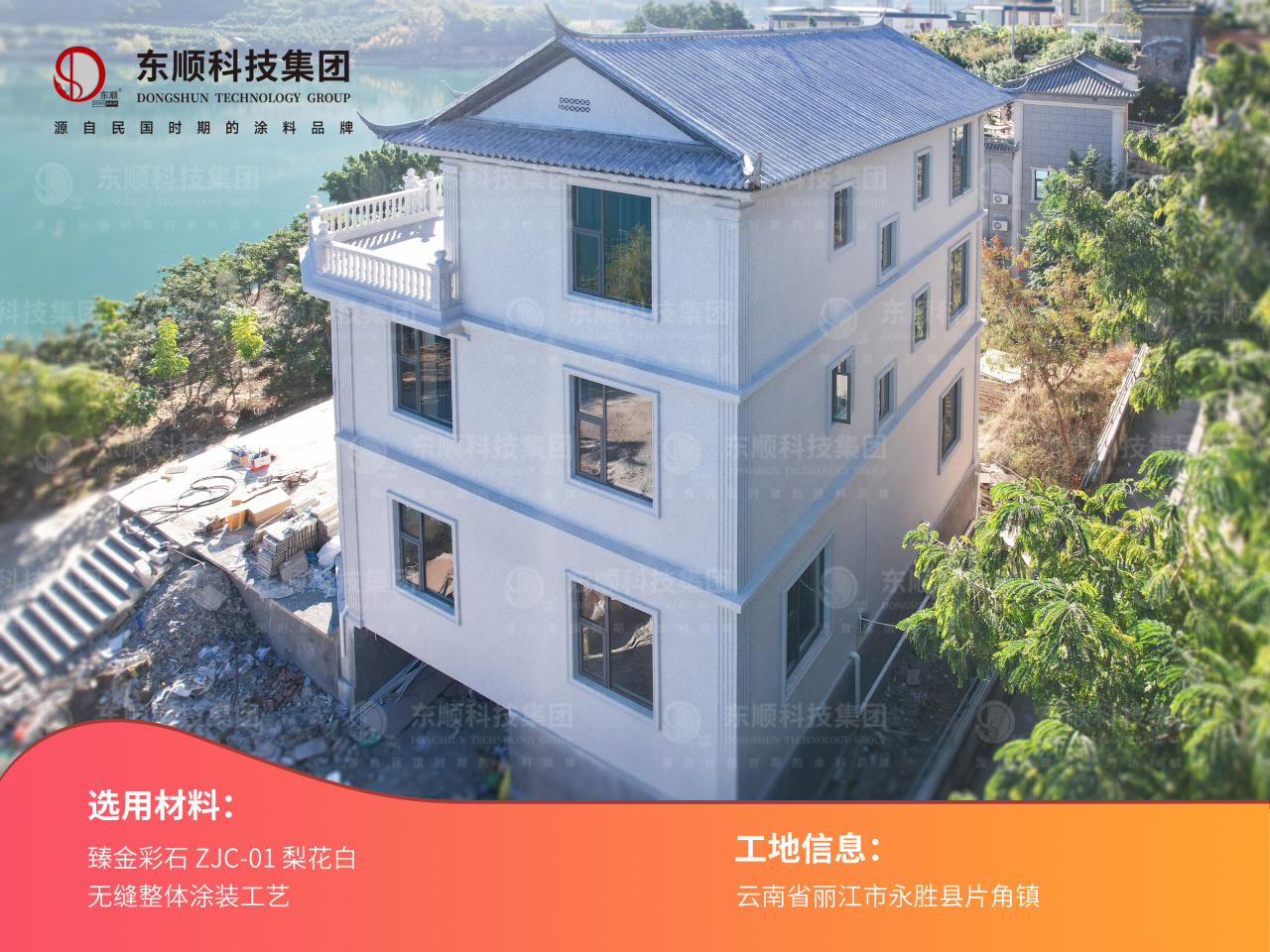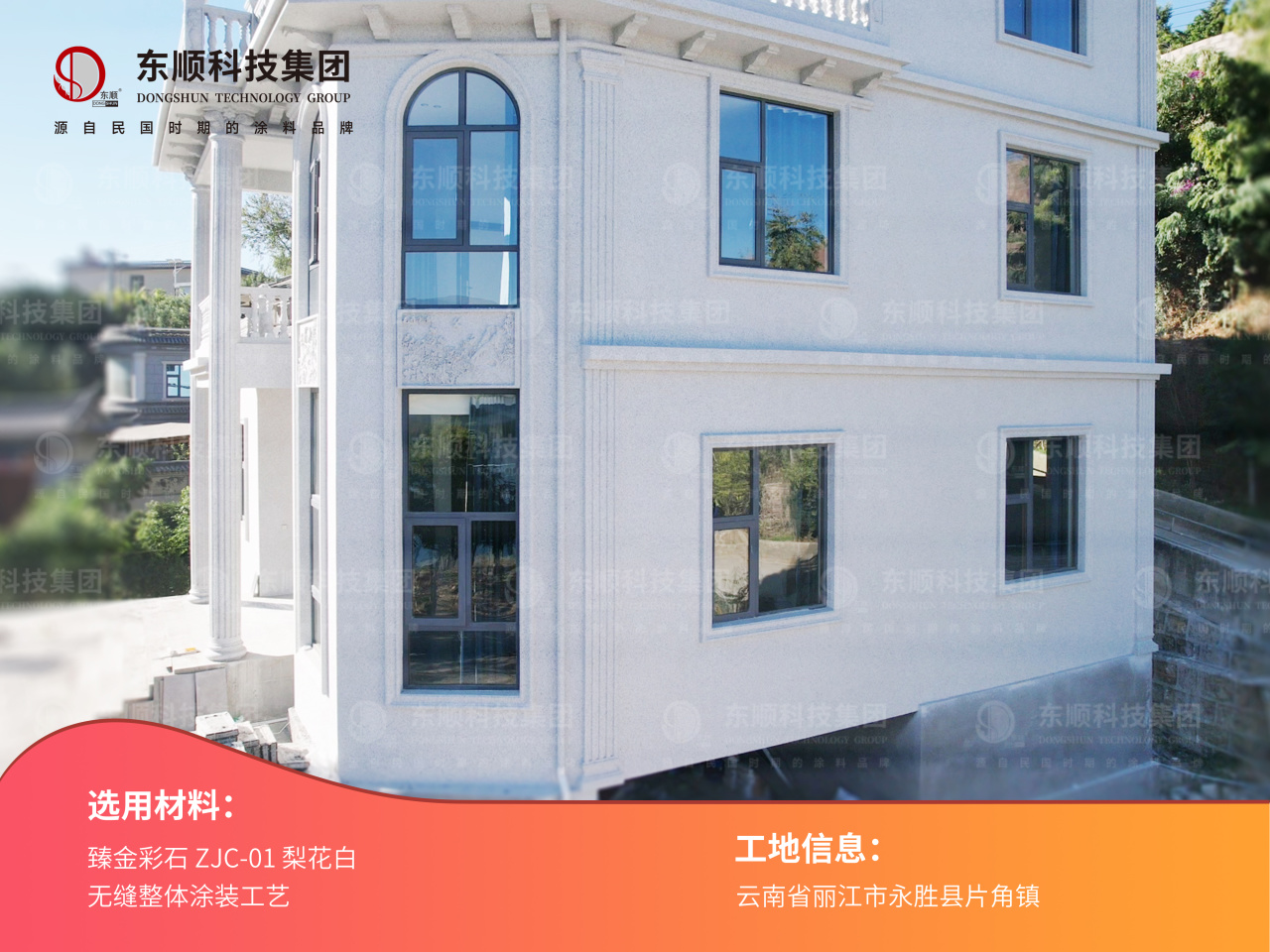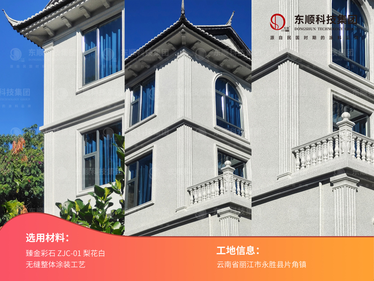 云南省丽江市永胜县片角镇 臻金彩石别墅案例 色号:ZJC-01梨花白 无缝整体涂装工艺
